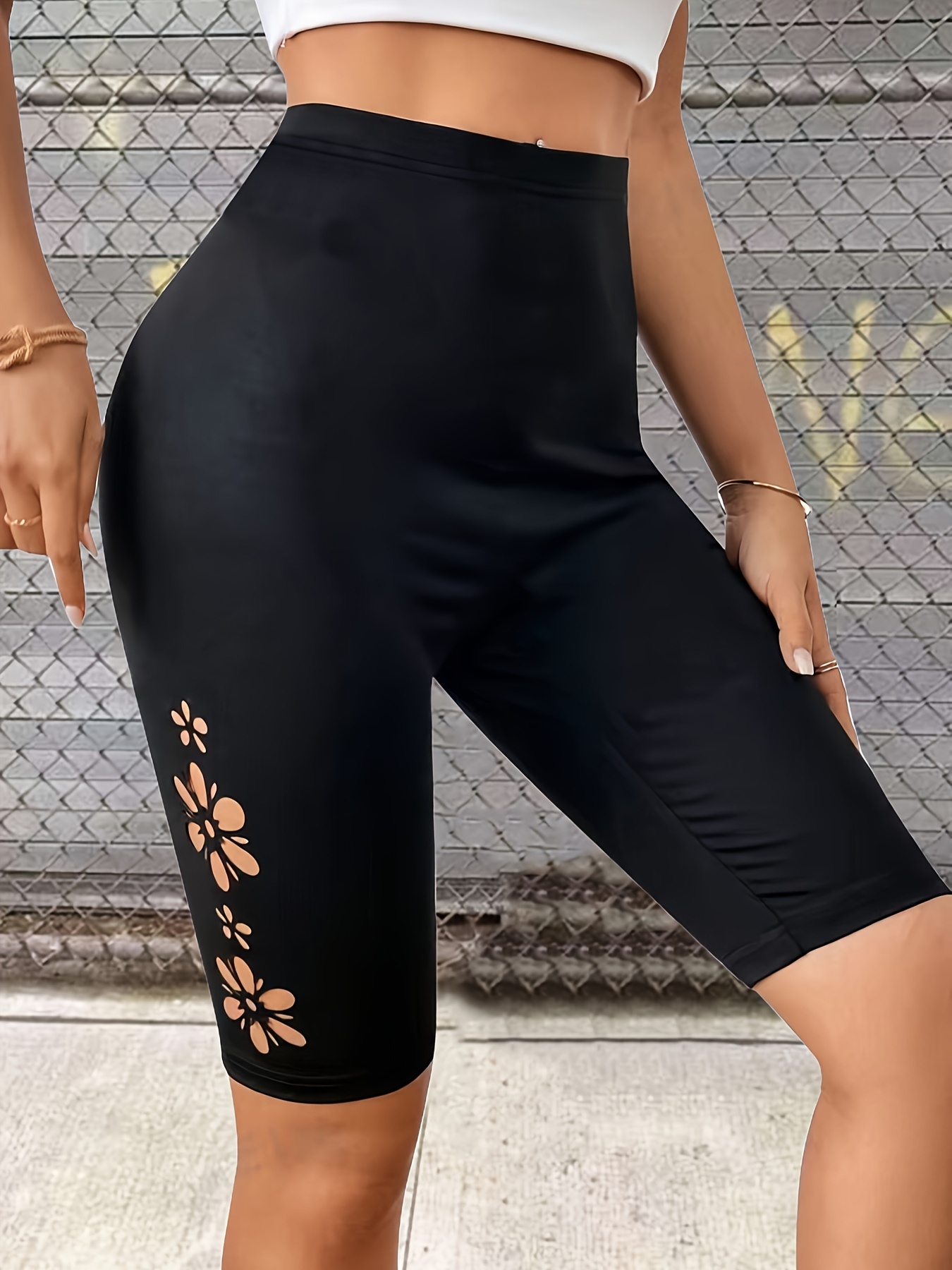 High Waist Skinny Stretchy Shorts, Floral Hollow Out Casual Solid Color Shorts For Spring & Summer, Women's Clothing