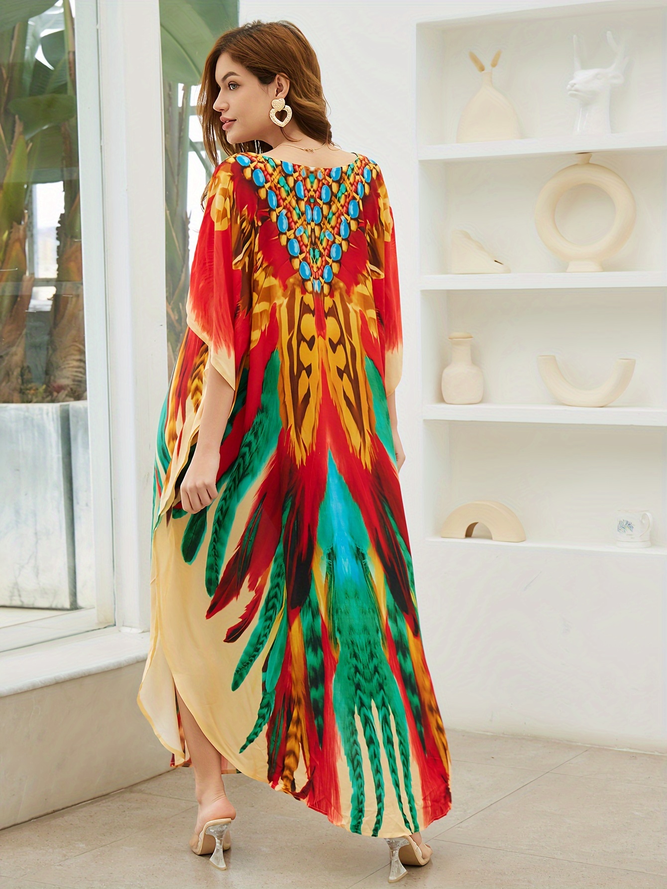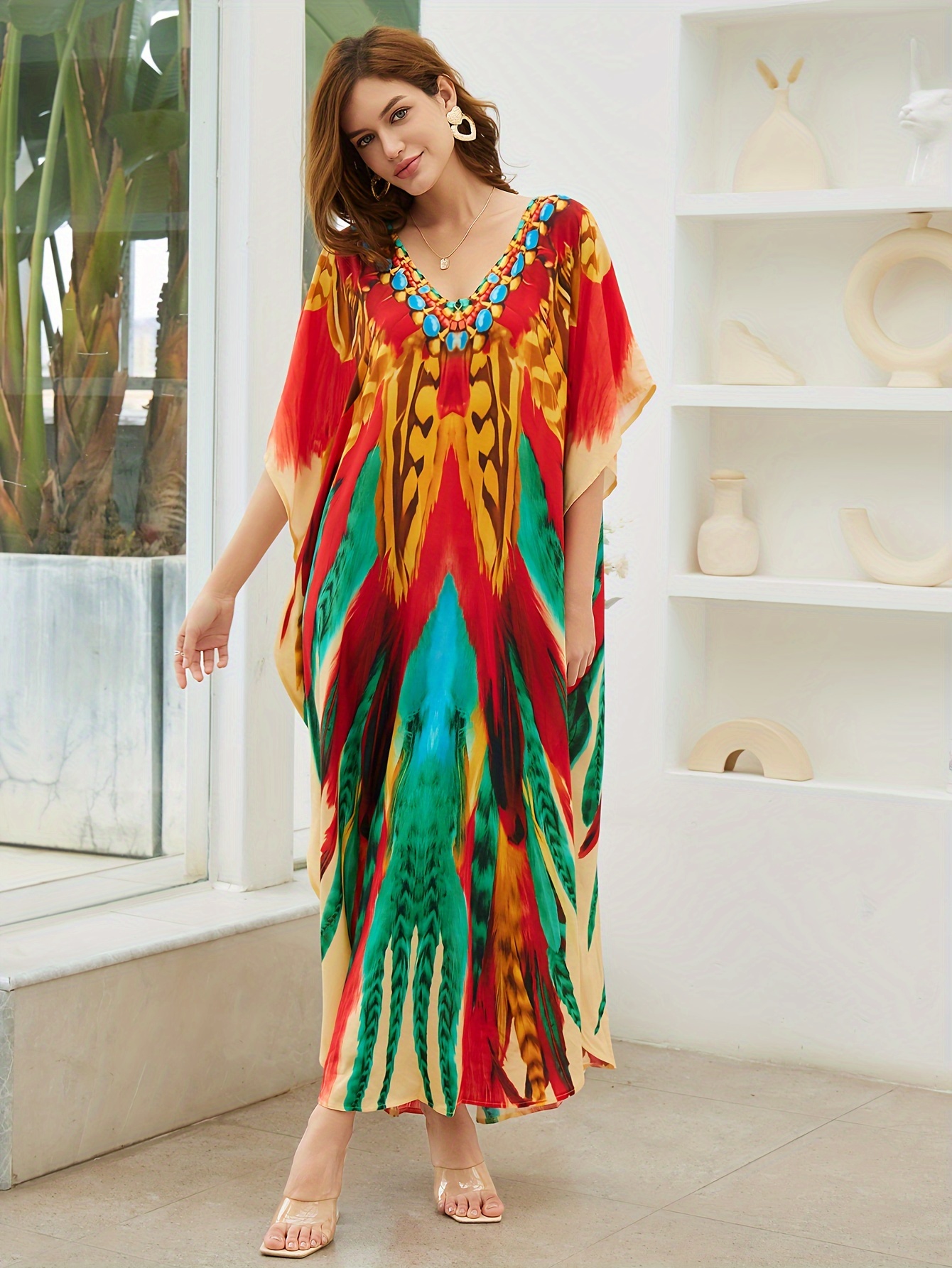 Plus Size Boho Chic Allover Print Loose Kaftan Dress - Relaxed, Comfortable Fit, Flattering V-Neckline, Dramatic Batwing Sleeves, Perfect Coverup for Any Occasion - Designed Exclusively for Women, Plus Size Friendly, Maxi Dress