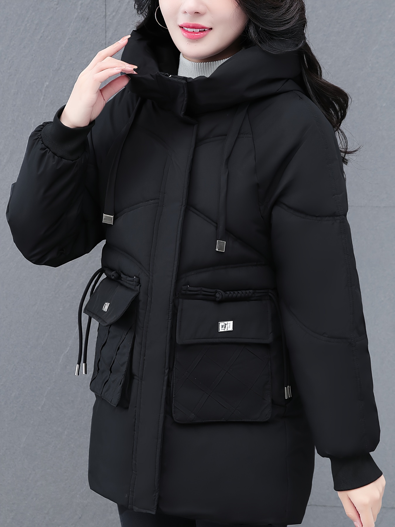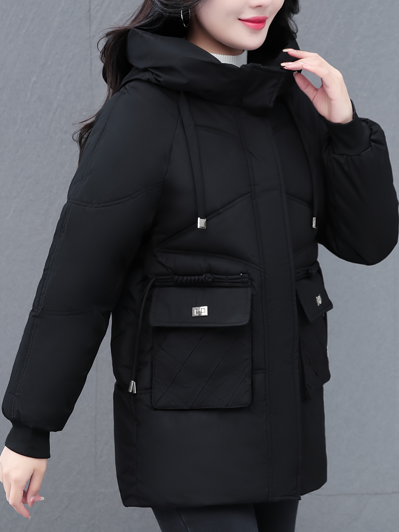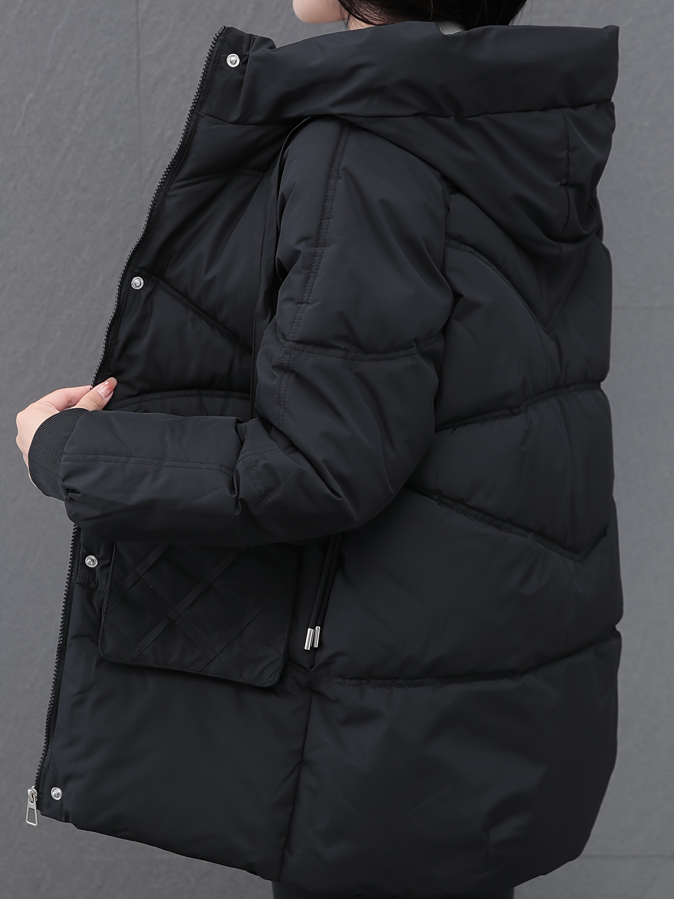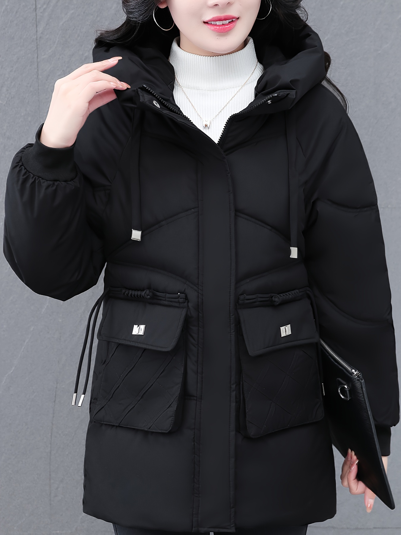 1pc Winter Women'S Casual Hooded Coat, Thickened Cotton Jacket with Zipper, Solid Color Polyester Non-Stretch Regular Length Outerwear