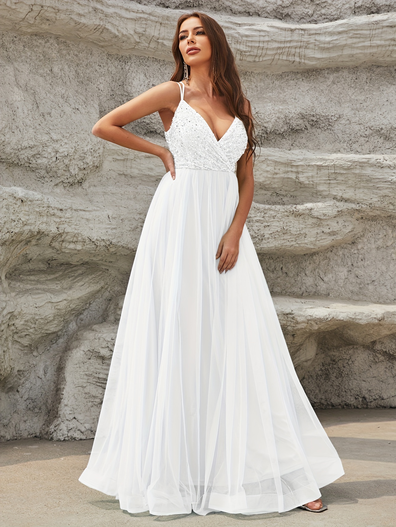 Elegant Sequined Mesh Big Swing Sleeveless Bridesmaid Dress, V-Neck Splicing Wedding Party Dress for Women