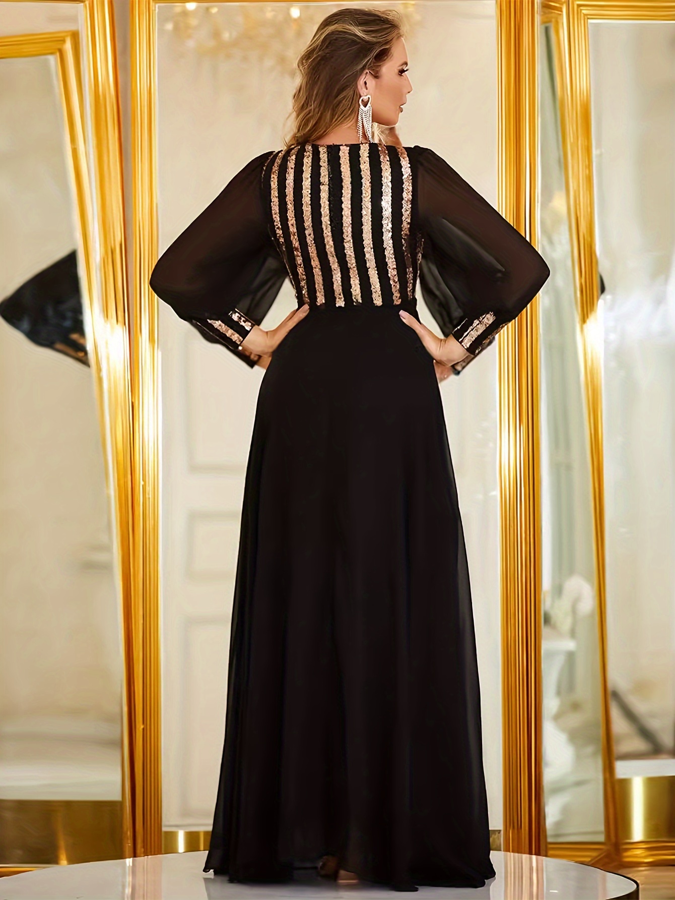 Elegant V-Neck Long Sleeve Dress with Sequin Detail - Polyester & Elastane Blend, Perfect for Parties & Banquets