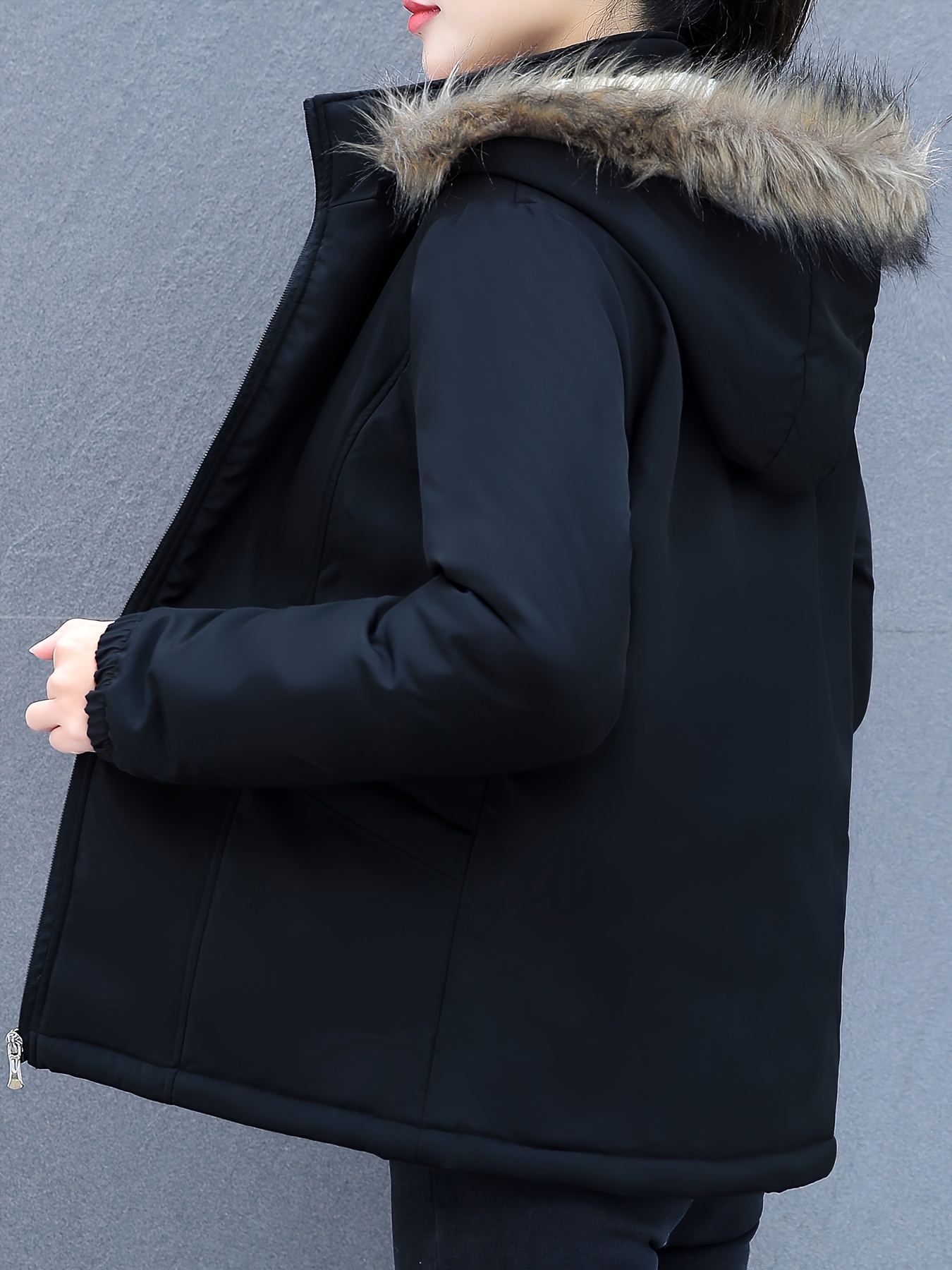 Women's Short Sleeve Winter Coat , Faux Fur Hooded Jacket, Casual Polyester Pullover, Solid Color, Regular Fit, Long Sleeve, No Belt, Zipper Front, Winter Fashion
