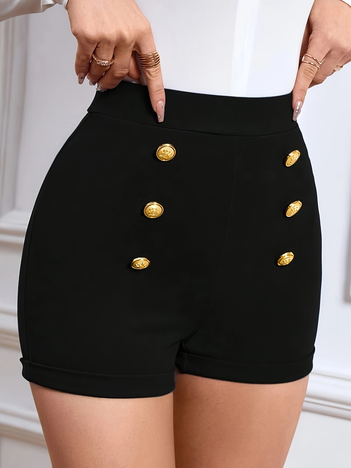 Solid Color High Waist Knitting Shorts, Casual Button Front Skinny Shorts For Every Day, Women's Clothing